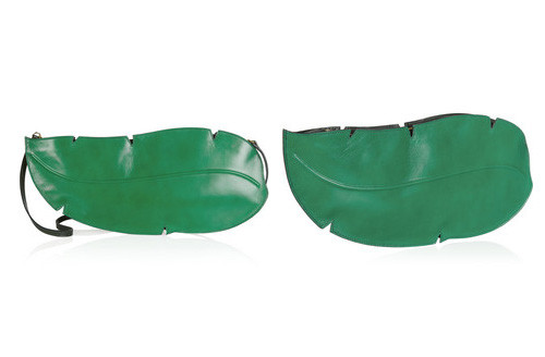 A clutch Charlotte Olympia, em forma de folha, e em dois tons de verde.