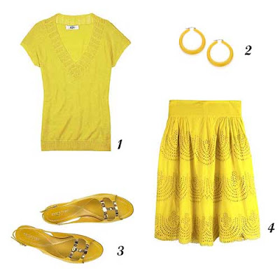 Outra das tendências que marcará as peças mais fresquinhas da próxima temporada é o tom amarelo frutado, bem choc!1. Camisola Tibi. 2. Brincos Accessorize. 3. Sandálias Sergio Rossi. 4. Saia Tibi.