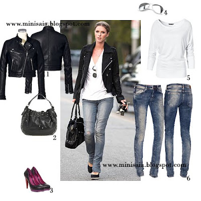 1. Blusão H&M. 2. Carteira Karen Millen. 3. Sapatos Carvela. 4. Óculos de Sol Ray-Ban. 5. Camisola H&M. 6. Jeans H&M.