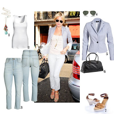 1. Colar ASOS. 2. Top H&M. 3. Jeans H&M. 4. Óculos de sol Ray Ban. 5. Blazer H&M. 6. Carteira SO'HOME, na La Redoute. 7. Sandálias La Redoute Création.