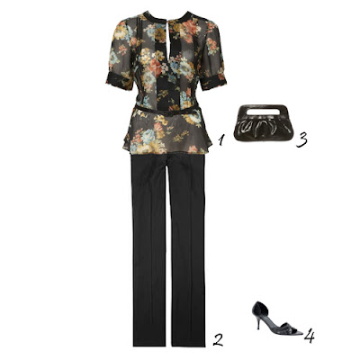 1. Blusa Massimo Dutti. 2. Calças Viktor & Rolf, à venda no site de venda on-line Net-a-Porter. 3. Clutch Massimo Dutti. 4. Sandálias Aldo.