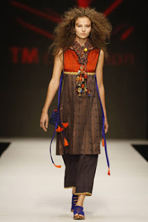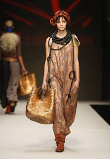 - Os tecidos apresentados eram à base de sedas, linhos e algodões. Em termos de cores, tudo o que lembra África estava presente: dourado, acobreado, prateado, azul cobalto, verde antigo, encarnado, laranja, entre outras. Muitos dos tecidos estavam impressos com padrões africanos, enquanto que outros apresentavam bordados bonitos e originais, com missangas, ráfia, fios metálicos e lantejoulas.