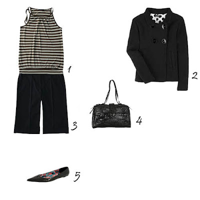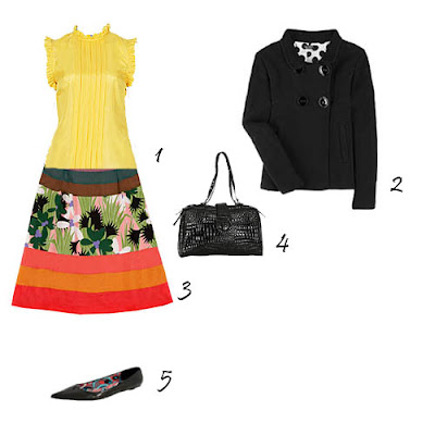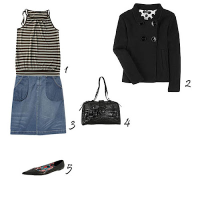 1. Top Naf Naf. 2. Casaco Sonia Rykiel, à venda no site Net-a-Porter. 3. Saia à venda na La Redoute. 4. Carteira Zara. 5. Sapatos Zara.