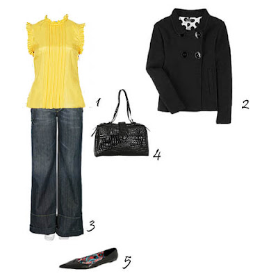 1. Top Zara. 2. Casaco Sonia Rykiel, à venda no site Net-a-Porter. 3. Jeans Zara. 4. Carteira Zara. 5. Sapatos Zara.