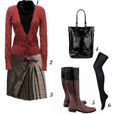 1. Camisola preta La Redoute. 2. Camisola laranja La Redoute. 3. Saia La Redoute. 4. Carteira Accessorize. 5. Botas Édéis para La Redoute. 6. Collants Accessorize.