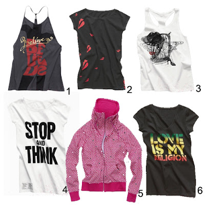 1. Top concebido por Rihanna. 2. T-shirt concebida por Jade Jagger. 3. Top concebido por Rufus Wainwright. 4. T-shirt concebida por Katharine Hamnett. 5. Casaco concebido por Tiga. 6. T-shirt concebida por Ziggy Marley.