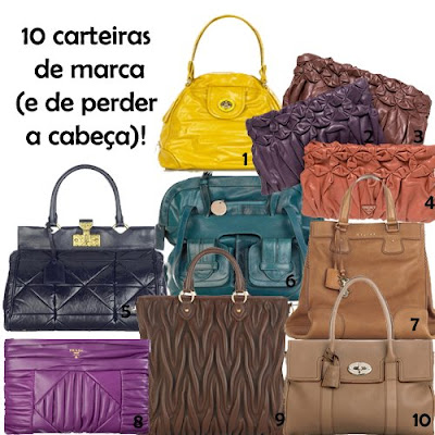 1. Carteira Marc by Marc Jacobs, à venda no site de venda on-line NET-A-PORTER.COM. 2. 3. 4. Bolsas Prada, à venda no site da marca. 5. Carteira Marc Jacobs, à venda no site de venda on-line NET-A-PORTER.COM. 6. Carteira Chloé, à venda no site de venda on-line NET-A-PORTER.COM. 7. Carteira Celine, à venda no site de venda on-line NET-A-PORTER.COM. 8. Carteira Prada, à venda no site da marca.9. Carteira Miu Miu, à venda no site de venda on-line NET-A-PORTER.COM. 10. Carteira Mulberry, à venda no site de venda on-line NET-A-PORTER.COM.