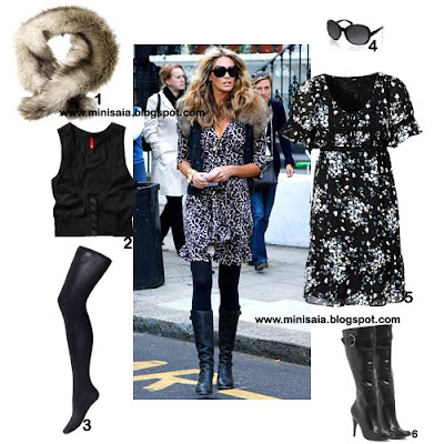1. Gola em pêlo H&M. 2. Colete H&M. 3. Collants Accessorize. 4. Óculos de sol Ray-Ban. 5. Vestido H&M. 6. Botas Dune.