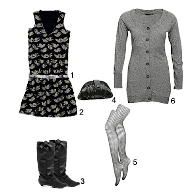 1. Cinto Soft Grey, à venda na La Redoute. 2. Vestido Naf Naf. 3. Botas à venda no site Asos.com. 4. Clutch à venda no site Asos.com. 5. Collants Accessorize. 6. Casaco H&M.