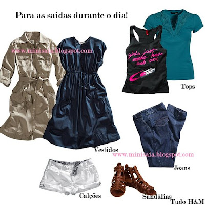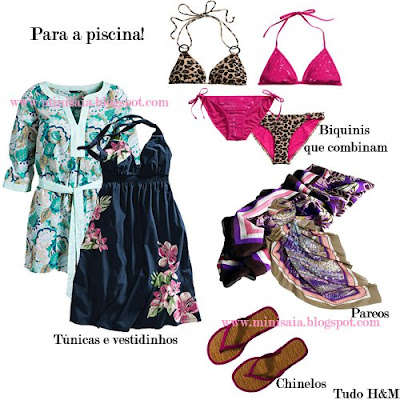 - Saídas de praia, túnicas ou pareos são um óptimo complemento aos dias de piscina, mas também vestidinhos (1 ou 2), um chapéu, um par de chinelos e um bom saco de praia, em palha por exemplo, para poder ter à mão tudo o que for necessário: desde livros a revistas, protectores solares, óculos de sol, pentes, entre outras coisas.