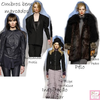 - Regressam os chumaços e os ombros BEM marcados: foram presença assídua em quase todas as colecções e serão, sem dúvida, uma tendência forte! As peças com pêlo continuarão a usar-se, bem como casacos e outras peças de inspiração militar!