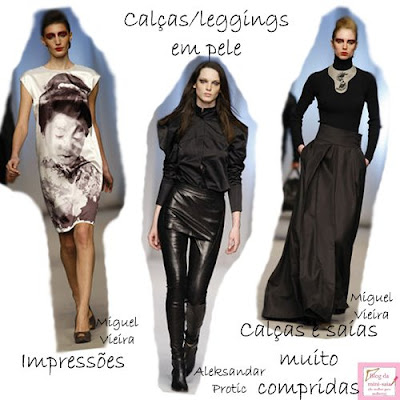 - Muita pele, presente em casacos, saias e calças/leggings, alia-se a estampados gráficos e a impressões. Outra tendência serão as calças e saias bem compridas e largas, a esconder os sapatos.