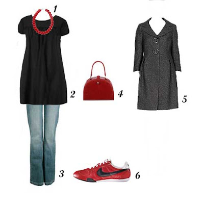 1. Colar Accessorize. 2. Vestido H&M. 3. Jeans Morgan. 4. Carteira Accessorize. 5. Casaco Zara. 6. Sapatilhas Nike.