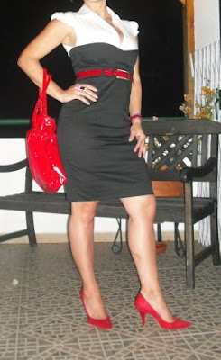 Vestido preto Venca. Sapatos vermelhos Zara. Relógio vermelho Gucci. Bolsa vermelha Bata. Anel vermelho Bijoux Brigitte.