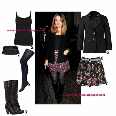 1. Clutch ASOS. 2. Top H&M. 3. Botas Firetrap. 4. Collants Accessorize. 5. Blazer H&M. 6. Cinto Forever21. 7. Saia Forever21.