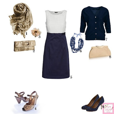 1. Écharpe H&M. 2. Clutch H&M. 3. Flor H&M. 4. Sandálias Soft Grey, na La Redoute. 5. Vestido H&M. 6. Colar Mango. 7. Cardigan H&M. 8. Clutch Accessorize. 9. Sapatos Massimo Dutti.