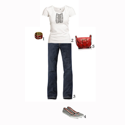 1. Bangles ASOS. 2. T-shirt H&M. 3. Jeans ACTIVE WEAR, à venda em La Redoute. 4. Sabrinas Underground, à venda em ASOS.com. 5. Carteira Oasis, à venda em ASOS.com.