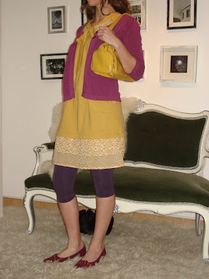 Vestido/mala La Redoute (colecção Primavera-Verão 2009). Leggings Calzedonia (colecção Primavera-Verão 2009). Sapatos da Sapataria Jessica, Rua dos Fanqueiros, Baixa Lisboeta. (liquidação total que ainda decorre! Custaram 3 euros!). Casaquinho de malha da Boutique Maria (isto é, dos "Chineses"), Loja nº155 do Centro Comercial Palmeiras, em Oeiras.