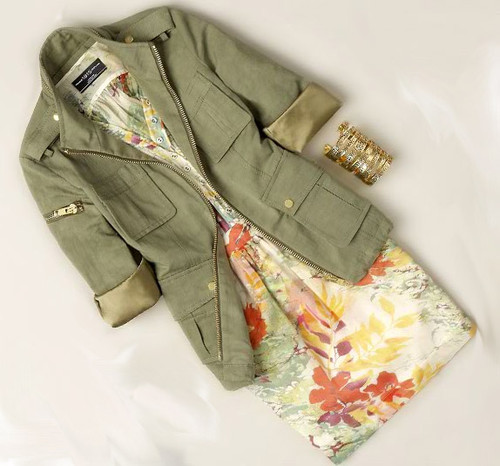 Dois tons florais em cores pastel, que se ligam com um casaco de inspiração Safari (ou Militar, consoante o ponto de vista).